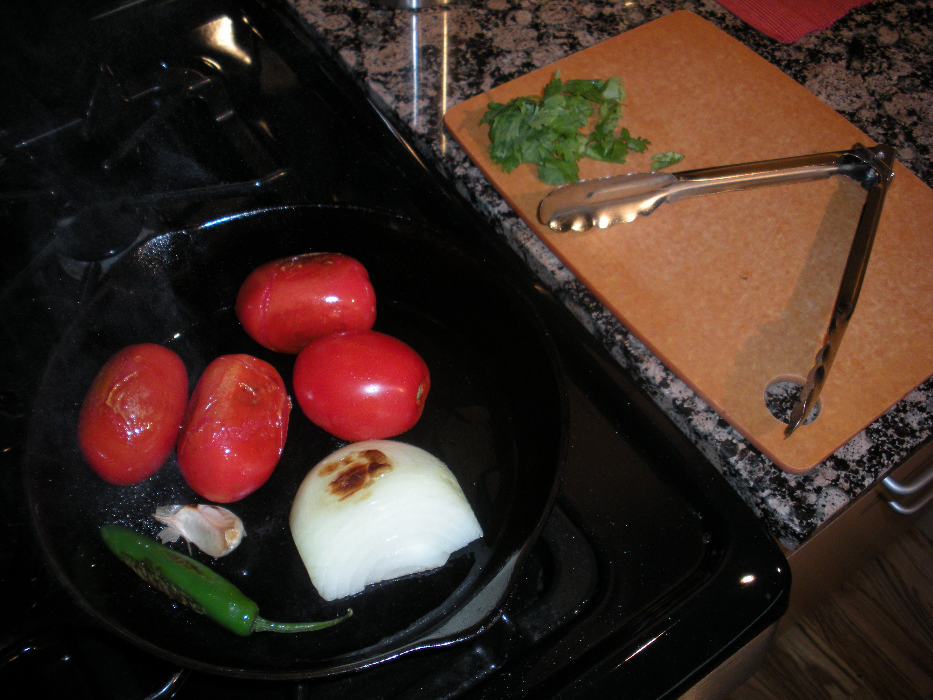 The salsa is incredibly simple. Each ingredient is pan roasted and then thrown into a blender with s/p and about 1/2 c. of water. The garlic is NOT peeled during roasting. This protects it from burning. The peel is easily removed after roasting.